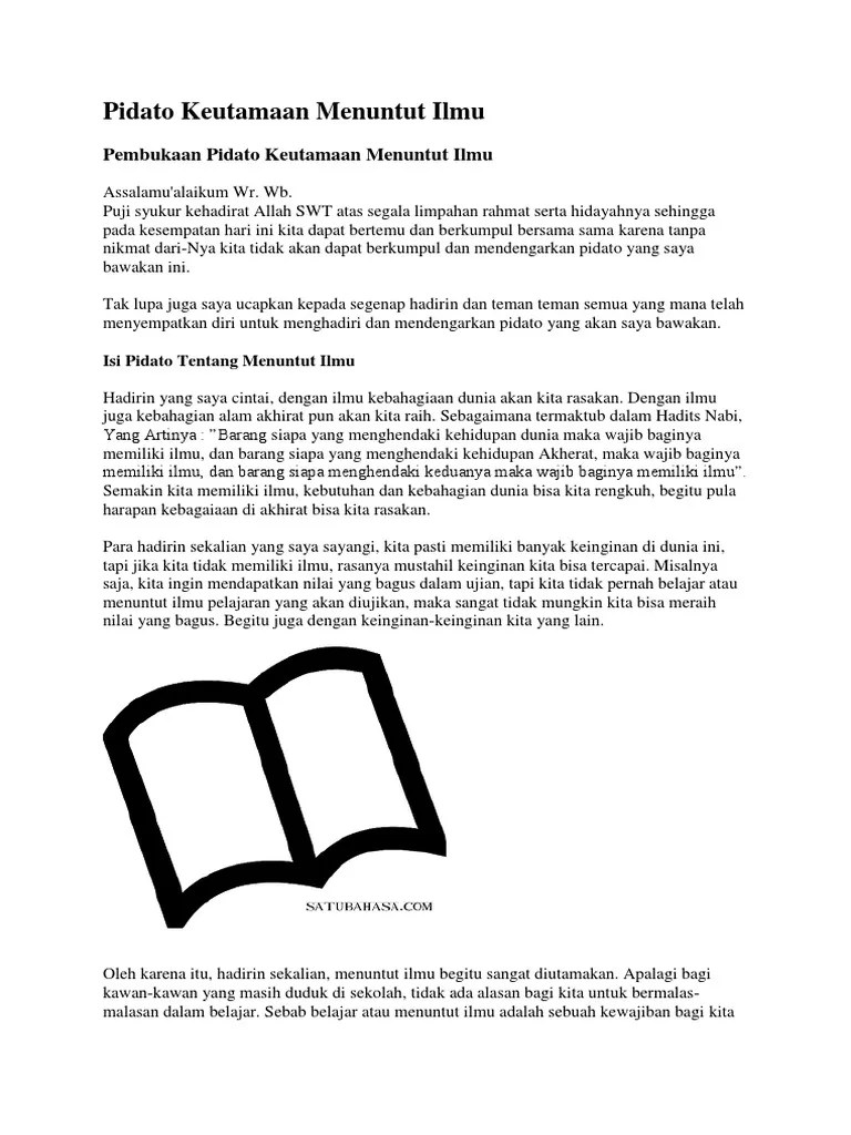 Materi ceramah yang baik yaitu materi yang dapat membuat pendengar secara . Berdirinya saya disini, saya akan berceramah mengenai "menuntut ilmu". Demikian, materi singkat yang dapat saya sampaikan, semoga allah memberi kemudahan kepada kita. Bagi kamu yang saat ini sedang mencari materi tentang ilmu untuk disampaikan dalam sebuah ceramah atau kamu adalah pelajar yang sedang . Contoh ceramah singkat dengan tema keutamaan ilmu syar'i;